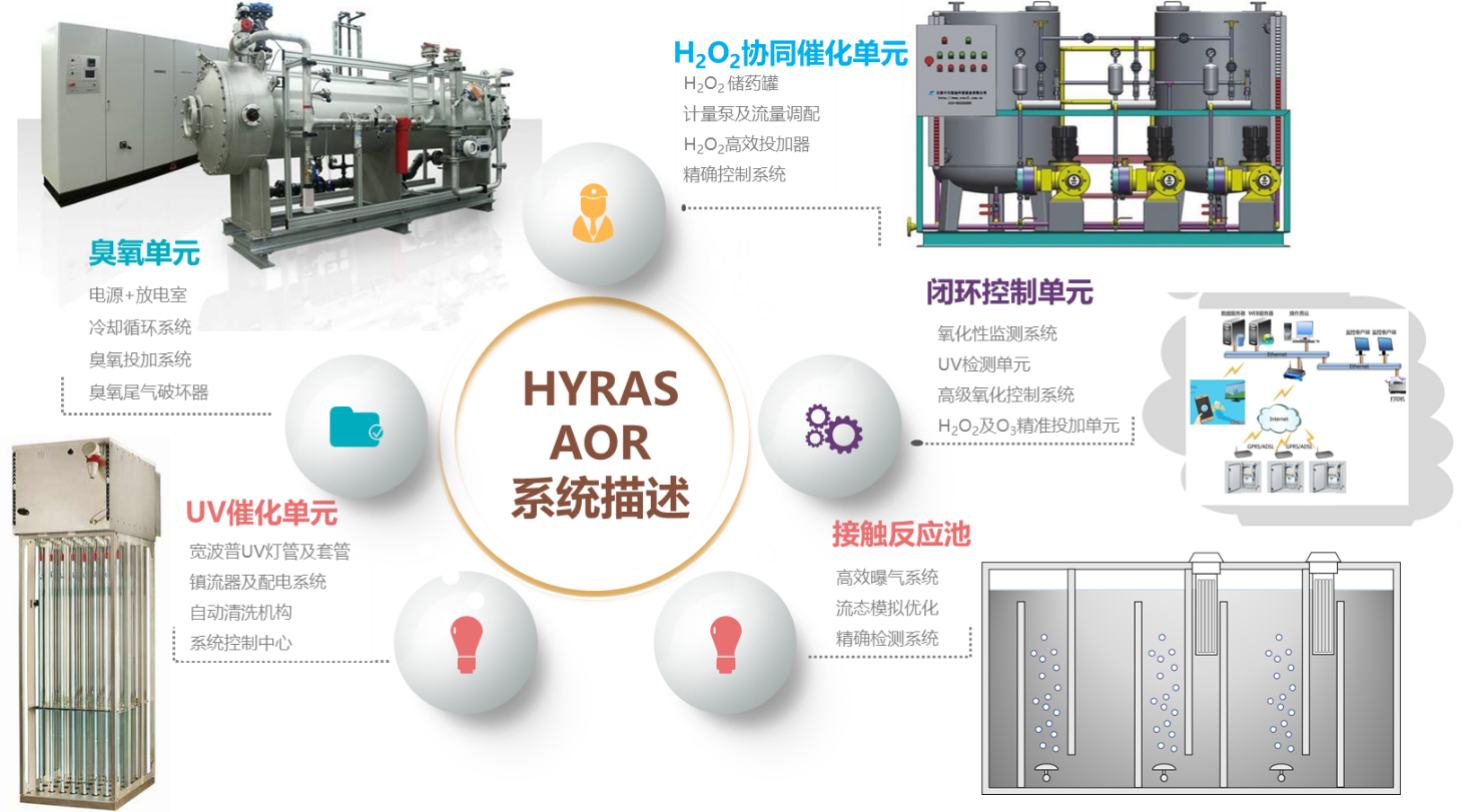 O3/H2O2/UV系統(tǒng)主要由接觸反應(yīng)池、臭氧單元、UV催化單元、H2O2協(xié)同催化單元、閉環(huán)控制單元五部分組成。