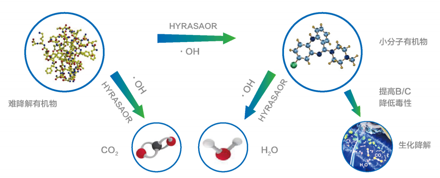 思普潤(rùn)HYRASAOR (Hydroxyl Radical Special Advanced Oxidation Reactor)高級(jí)氧化體系,通過UV光催化臭氧并在H2O2的協(xié)同作用下高效產(chǎn)生強(qiáng)氧化性·OH自由基,從而實(shí)現(xiàn)難降解有機(jī)污染物斷鏈、開環(huán),形成小分子有機(jī)物,并最終礦化為CO2和H2O。