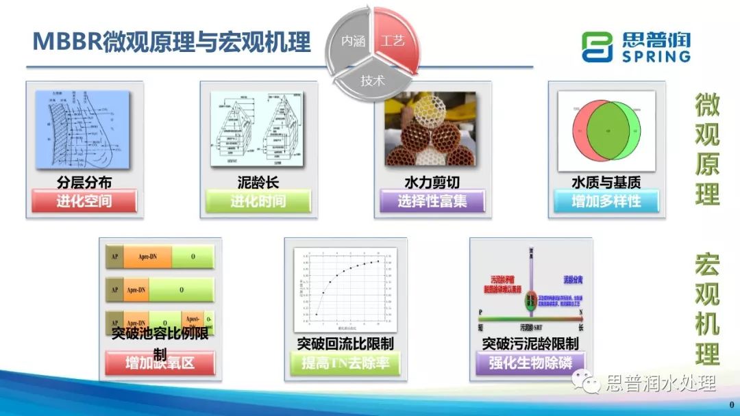 MBBR不僅僅是增大生物量,是具有豐富微觀原理及宏觀機(jī)理內(nèi)涵的新工藝、新技術(shù)。微觀上,懸浮載體為微生物的進(jìn)化提供了時(shí)間和空間,水力剪切對(duì)于生物掛膜具有重要作用,懸浮載體引入增加了微生物菌落的多樣性;宏觀上,MBBR突破了非好氧池容與好氧池容比例的限制,原池五段Bardenpho改造突破了TN回流比的限制,雙泥齡系統(tǒng)突破了傳統(tǒng)活性污泥法氮磷泥齡矛盾的限制。