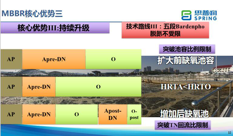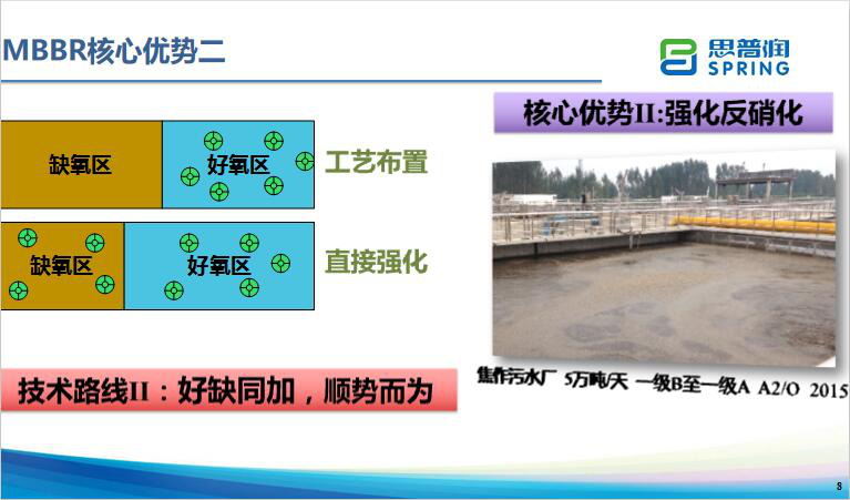 思普潤(rùn)MBBR工藝成功的應(yīng)用,是建立在我們對(duì)機(jī)理和應(yīng)用不斷探索研究上的,我們還研發(fā)儲(chǔ)備了多條應(yīng)用路線(xiàn),根據(jù)進(jìn)水水質(zhì)濃度的高低、出水標(biāo)準(zhǔn)的不同,停留時(shí)間的長(zhǎng)短等項(xiàng)目特點(diǎn),進(jìn)行針對(duì)性的選用。