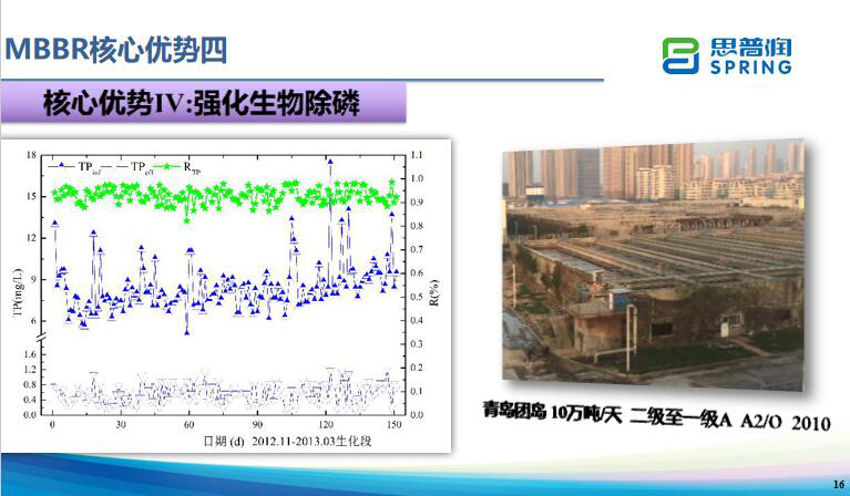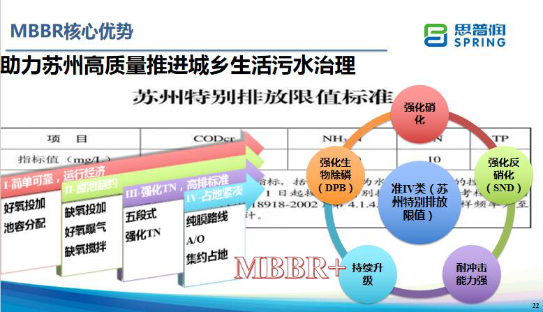 思普潤(rùn)成立于2006年,至2008年我司通過(guò)大量試驗(yàn)保證水力學(xué)的成功; 2008年至2014年,在前一階段成功的基礎(chǔ)上,我們開(kāi)始了大規(guī)模的工程應(yīng)用,根據(jù)不同的池型、水質(zhì)等因素進(jìn)行自主設(shè)計(jì)施工,保證工藝穩(wěn)定達(dá)標(biāo)。從2014年到現(xiàn)在,我司做到在保證工藝穩(wěn)定達(dá)標(biāo)的基礎(chǔ)上進(jìn)行節(jié)能降耗。從整個(gè)時(shí)間發(fā)展上看,思普潤(rùn)是與MBBR在國(guó)內(nèi)的發(fā)展是同步的,總結(jié)起來(lái)我司的MBBR工藝包核心共有五大優(yōu)勢(shì)。
