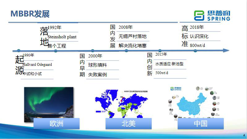 青島思普潤(rùn)成立于2006年,從2006年到2008年是公司發(fā)展MBBR的第一個(gè)階段,主要是不出現(xiàn)失敗案例,保證水力學(xué)的成功;從2008年到2014年,在第一階段成功的基礎(chǔ)上,我們開始了大規(guī)模的應(yīng)用,設(shè)計(jì)了不同的池型、不同的水質(zhì)等,保證工藝穩(wěn)定達(dá)標(biāo),從2014年到現(xiàn)在,我們主要是在工藝穩(wěn)定達(dá)標(biāo)的基礎(chǔ)上進(jìn)行節(jié)能降耗。從整個(gè)時(shí)間發(fā)展上看,思普潤(rùn)是與MBBR在國(guó)內(nèi)的發(fā)展是同步的。
