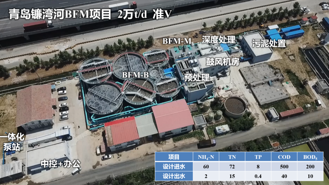 青島鐮灣河污水廠設計規(guī)模8萬m3/d,分2期建設,目前該污水廠兩期均已投入運行,進水量已達到滿負荷,現(xiàn)有污水處理廠處理能力不足,需新增2萬m3/d污水處理設施。經(jīng)現(xiàn)場勘查,廠內(nèi)僅有4300m2的可用地,新建污水廠面臨極度缺地的難題,要求各工藝段具備高效緊湊的特點,經(jīng)過反復論證,選用了BFM工藝,實施后噸水占地僅0.215m2,出水穩(wěn)定達到類Ⅴ類水標準。