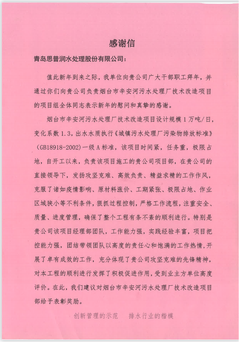 青島思普潤水處理股份有限公司始終秉承著以客戶為中心的核心價(jià)值觀,以先進(jìn)的工藝?yán)砟罴皟?yōu)秀的工程實(shí)施,為客戶解決實(shí)際問題,想客戶之所想,急客戶之所急,為水環(huán)境改善做出自己的貢獻(xiàn)!