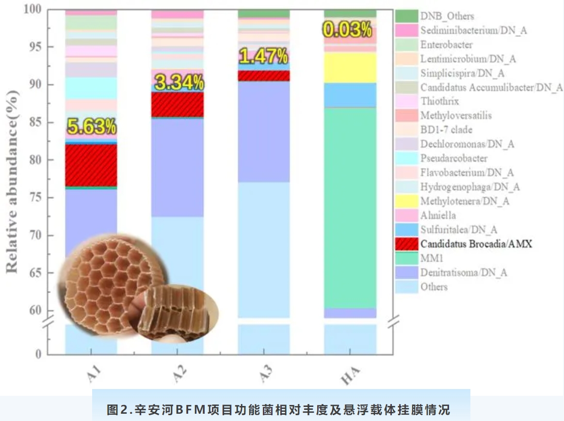 煙臺辛安河BFM項目基于生物膜高負荷性能實現(xiàn)了高效的脫氮除磷效果,出水氨氮≤0.5mg/L,TN<5mg/L(均值≤2mg/L)、TP≤0.1mg/L,冬季低溫條件下出水依然穩(wěn)定優(yōu)于設(shè)計排放標(biāo)準。項目構(gòu)建了“異養(yǎng)反硝化-自養(yǎng)厭氧氨氧化-同步硝化反硝化”的多途徑脫氮體系,實現(xiàn)了敏感型厭氧氨氧化菌的高效富集,相對豐度接近6%,厭氧氨氧化脫氮貢獻率長期且穩(wěn)定超過25%;好氧區(qū)基于生物膜分層分布特點實現(xiàn)反硝化菌富集,同步硝化反硝化脫氮貢獻率達15%以上,降低了傳統(tǒng)單一脫氮路徑對于碳源的需求,噸水直接運行費用降低0.2元/m3以上。智水優(yōu)控系統(tǒng)的加載保障了短流程下運行調(diào)控的快速響應(yīng)和厭氧氨氧化菌的精準控制,破除了主流自養(yǎng)脫氮工藝應(yīng)用壁壘,在高標(biāo)準基礎(chǔ)上實現(xiàn)節(jié)能降碳。