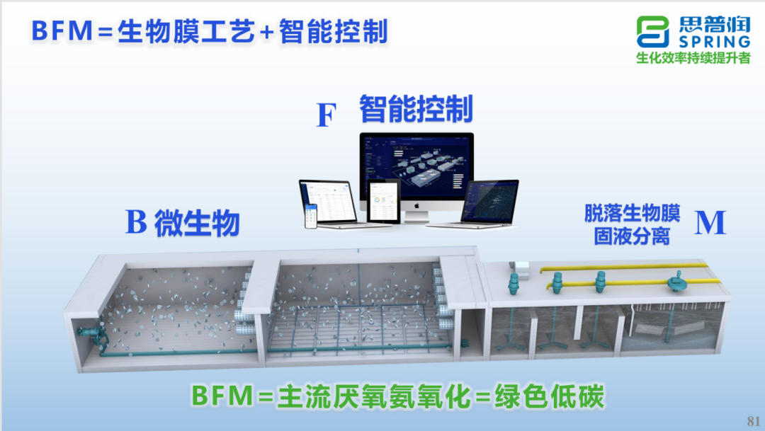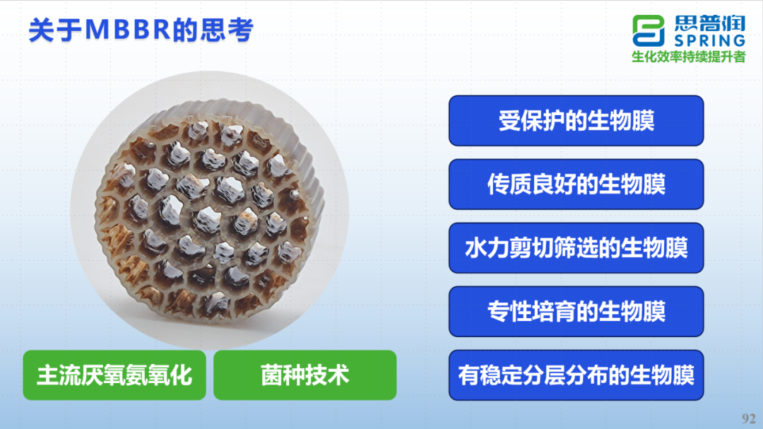 最后,思普潤(rùn)介紹了多年研究MBBR工藝的感悟,并強(qiáng)調(diào)MBBR發(fā)展,應(yīng)建立在以下5個(gè)條件基礎(chǔ)上,即“受保護(hù)的生物膜、傳質(zhì)良好的生物膜、水力剪切篩選的生物膜、專(zhuān)性培育的生物膜、有穩(wěn)定分層分布的生物膜”,只有做到這5點(diǎn)才能實(shí)現(xiàn)目標(biāo)菌群的高效富集培養(yǎng),才能有利于包括厭氧氨氧化菌在內(nèi)的難富集穩(wěn)定菌種的定植。未來(lái),MBBR不論在主流厭氧氨氧化,還是難降解有機(jī)物、新污染物去除上,均具有極大的發(fā)展?jié)摿?,可發(fā)揮生物選擇器、附著器的基礎(chǔ)性作用,助力污水廠(chǎng)綠色低碳發(fā)展。
